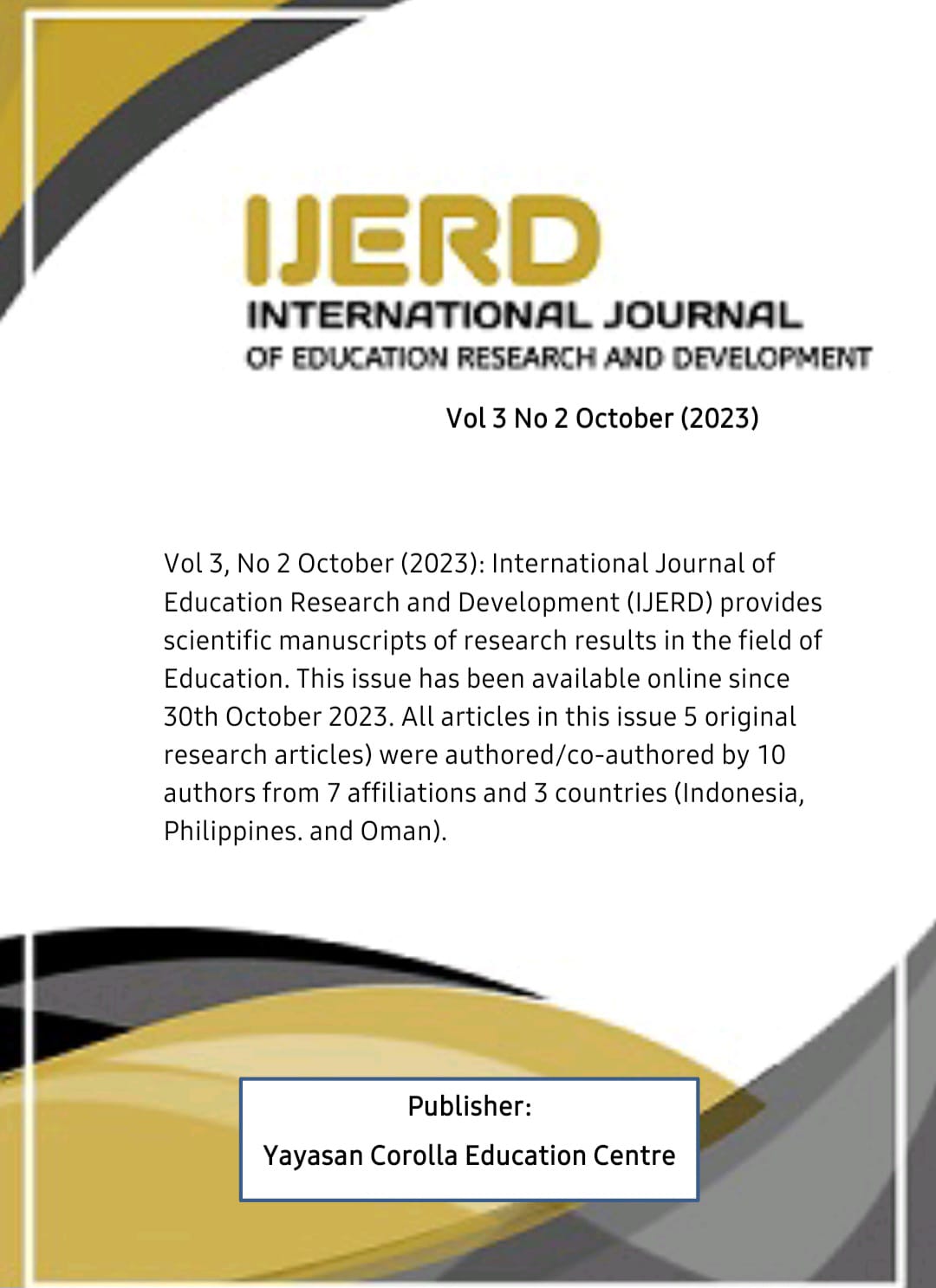 ##issue.vol## 3 ##issue.no## 2 (2023)Vol 3, No 2 October (2023): International Journal of Education Research and Development (IJERD) provides scientific manuscripts of research results in the field of Education. This issue has been available online since 30th October 2023. All articles in this issue 5 original research articles) were authored/co-authored by 10 authors from 7 affiliations and 3 countries (Indonesia, Philippines. and Oman).